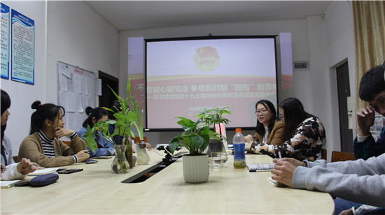 1月17日下午,学院团委组织开展了“不忘初心跟党走,争做新时代‘四有’新青年”学习贯彻党的十九大精神宣讲团宣报告会。活动由学习贯彻党的十九大精神梧州青年宣讲团成员、学院团委副书记银翠姣主讲,学院各社团负责人参加了本次活动。