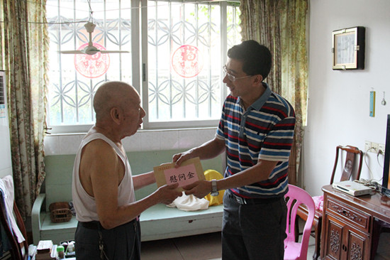 7月1日是建党纪念日。在这个喜庆的日子里,学院党委副书记、院长、职教中心主任聂振传专程登门看望退休老党员韦自兆,送上节日的祝福。 韦自兆已届82岁高龄,曾经参加过抗美援朝战争。在韦自兆家中,聂振传向老人表达节日的问候,关切地询问老人的身体情况,倾听老人讲述当年抗美援朝的峥嵘岁月,对老人一生所做出的奉献表示敬佩和赞赏。攀谈间,聂振传郑重叮嘱老人保重身体,祝福老人健康长寿,表示老人如生活有困难,学院(中心)会积极给予帮助。聂振传向老人送上慰问品和慰问金。