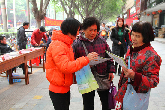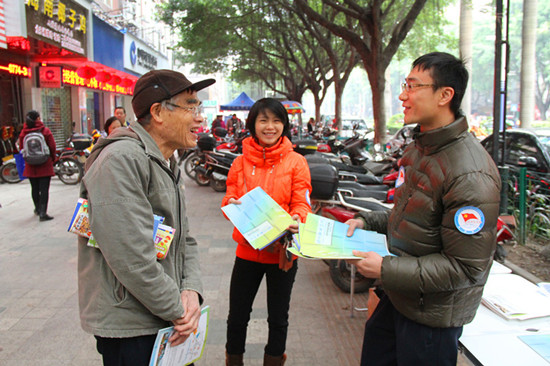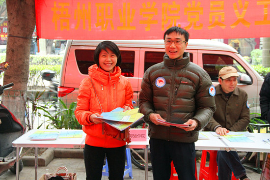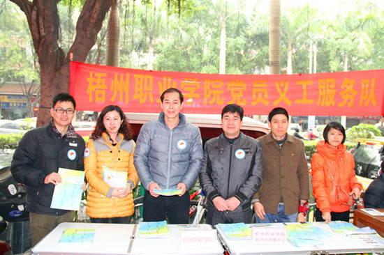 2月7日上午,梧州市举行“党员义工连万家,为民服务当先锋”全市机关党员义工春节集中为民服务活动,学院的党员义工们走上街头,热情为市民们提供招生入学咨询,受到市民的赞许。 当天上午,学院的党员义工们一大早来到大塘菜市路口,拉起为民服务的横幅,摆好摊点,开始向过往市民提供义务服务。党员义工们个个佩戴“西江党旗红”义工服务标志,以饱满的精神状态向群众分发招生宣传资料,宣传国家的招生考试政策,为市民提供入学升学咨询。前来咨询者不乏为孙辈升学操心但对国家招生考试政策一无所知的退休老人,党员义工们毫无例外地热情接待,不厌其烦地予以解答,赢得群众的首肯。 近年来,学院认真开展党员义工服务活动,每年均响应上级号召走上街头为民服务,使党员义工活动形成了常态化和制度化。
