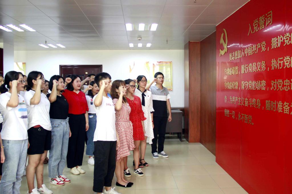 “我志愿加入中国共产党,拥护党的纲领,遵守党的章程,履行党员义务……”,6月27日下午,党员活动室内,面对鲜红的党旗,2019届毕业生党员们庄严地举起右手,重温入党誓词。