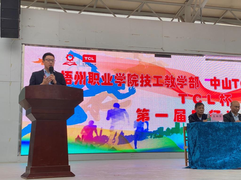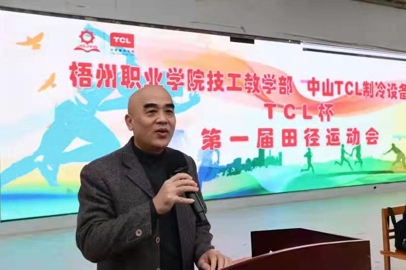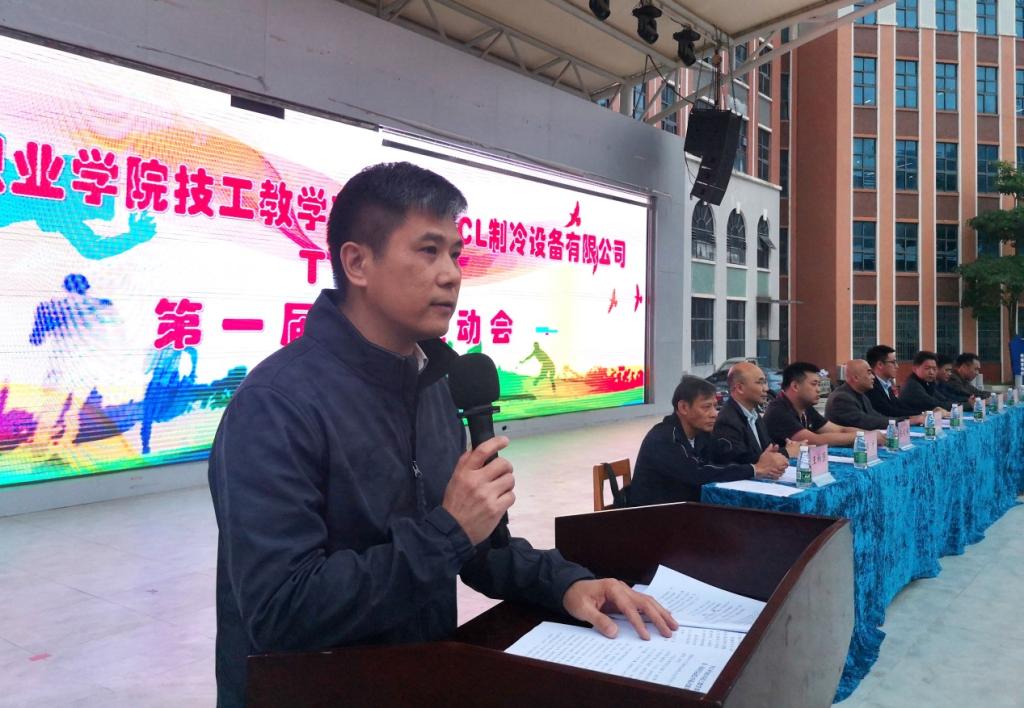 技工教学部党总支书记彭亦雄宣布运动会开幕,部长梁志华致开幕词,TCL中山制冷设备有限公司散件厂厂长向民军和人事主管陈耀辉莅临开幕式现场并送上由衷的祝福。