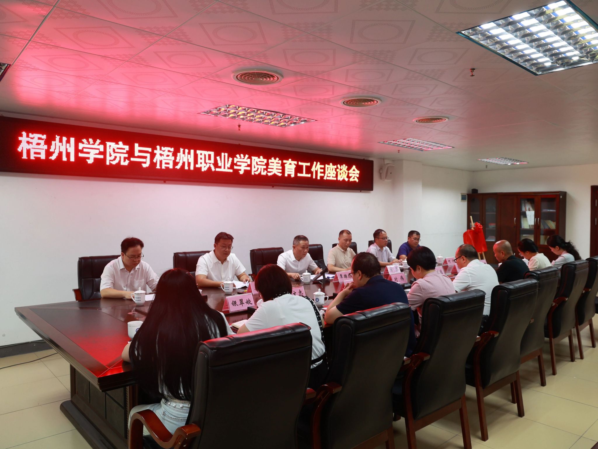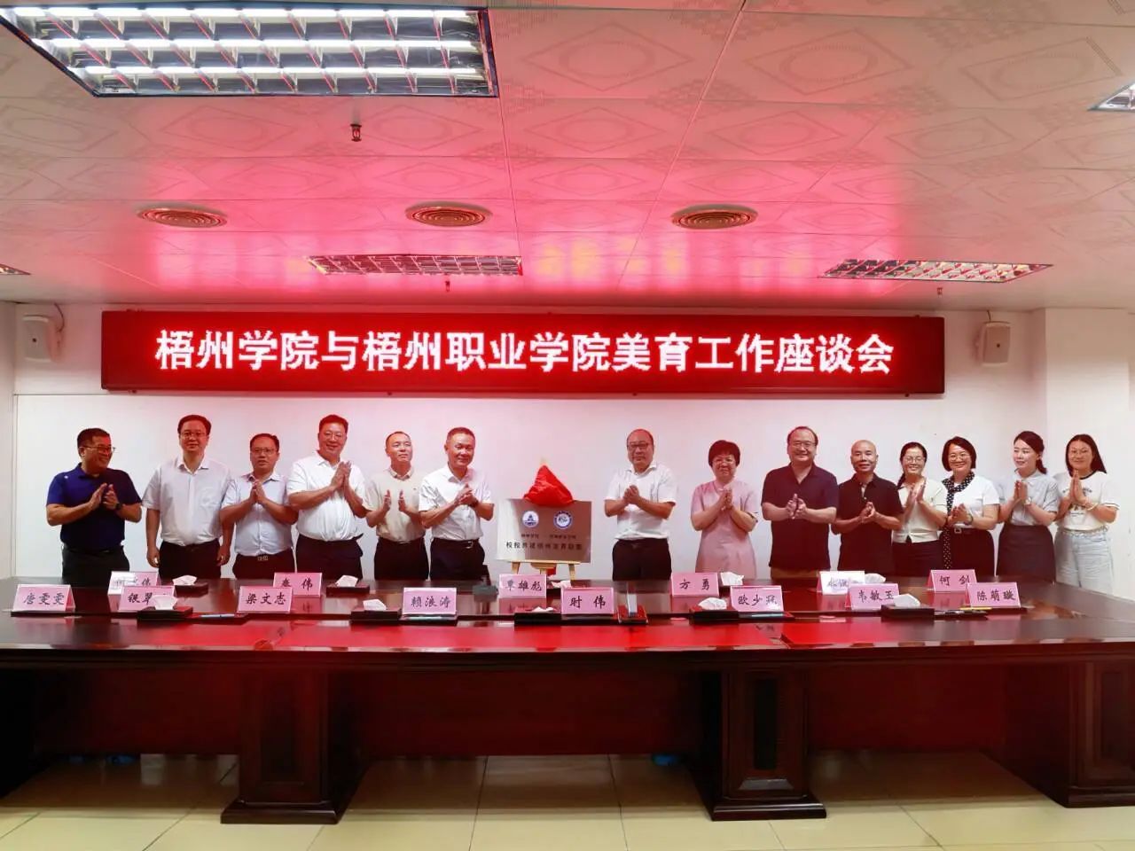 6月18日,梧州学院与beat365英国官网网站美育工作座谈会在办公培训综合楼六楼第一会议室举行。梧州学院副校长覃雄彪同志一行莅临beat365,学院党委书记时伟同志,学院党委副书记、纪委书记赖浪涛同志及两院相关职能部门负责人齐聚一堂,共商美育发展路径。