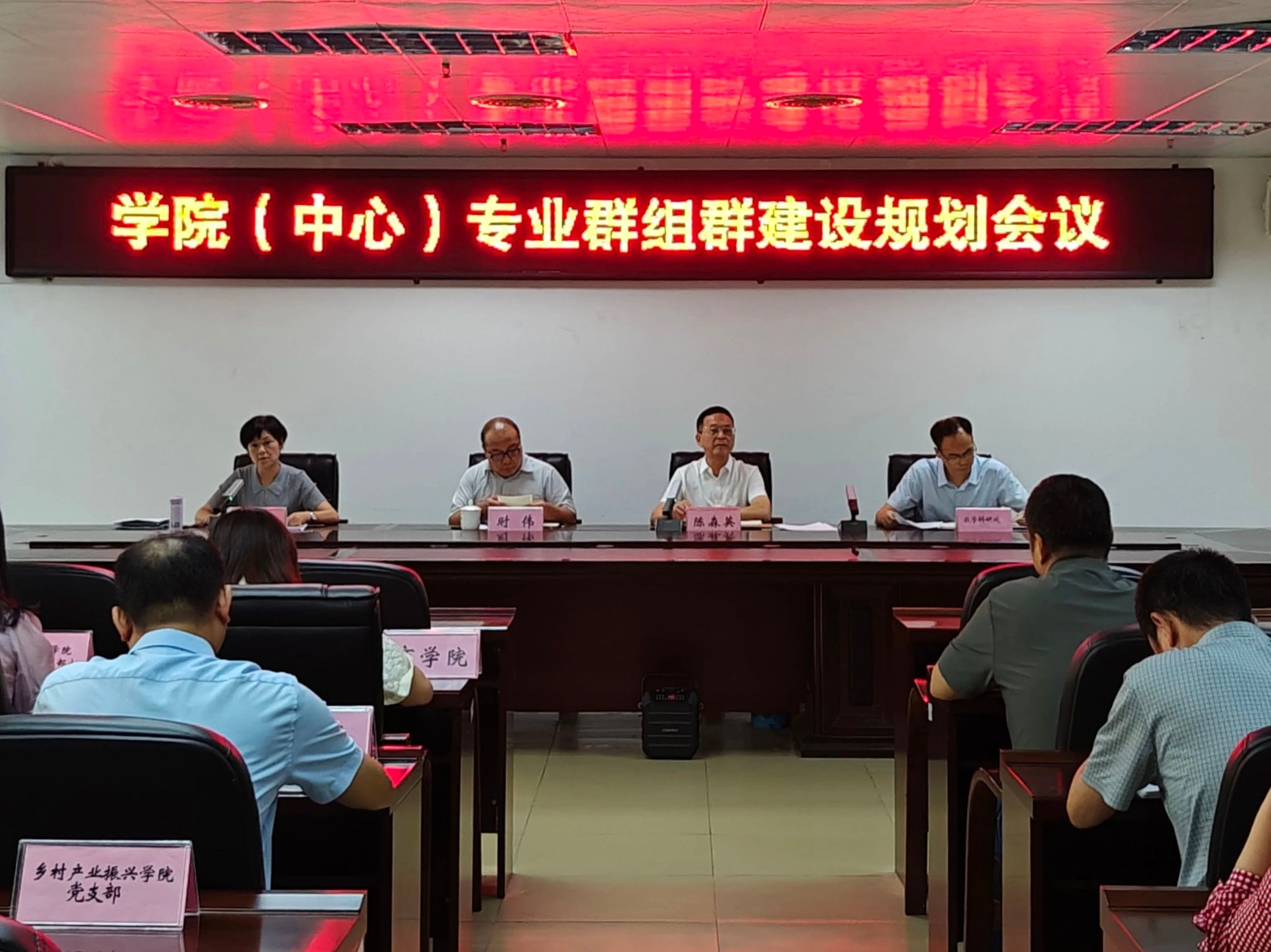 6月20日上午,在第一会议室召开专业群组群建设规划会议。学院党委书记时伟同志,学院党委副书记、院长、市职教中心主任陈森英同志,学院副院长、市职教中心副主任姚冰同志出席会议,会议由姚冰同志主持。各二级学院院长、分管教学副院长,以及学院新“‘双高计划’建设工作专班”成员参加了会议。