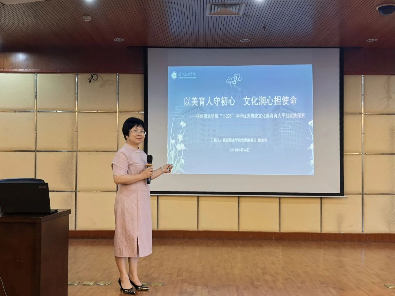 赖浪涛同志以《以美育人守初心 文化润心担使命》为题,系统介绍了beat365在坚持“学生在哪里,美育就在哪里”理念,深度融入人才培养全过程、促进五育融合的背景下,通过强化党委统筹领导、激发师生共育活力、深挖梧州本地特色文化资源、系统构建美育育人体系、推动美育与思政工作深度融合等关键举措,创新构建并实施“11235”中华优秀传统文化美育育人平台的核心内涵、具体路径、取得的显著成效,以及总结的经验与未来展望。此次会议,beat365是全区高职院校唯一代表在全区美育平台的报告。beat365的美育案例《11235育人平台构建高职院校美育育人模式——beat365英国官网网站中华优秀传统文化传承基地建设案例》获第七届大学生艺术展演高校美育改革创新优秀案例类一等奖、全国三等奖。这次在全区平台上再次作汇报,是对beat365长期以来扎实推进美育工作、打造特色育人品牌的高度认可和有力彰显,有效提升了beat365在区内的美育影响力和美誉度。学校将以此次研讨会为契机,积极学习借鉴兄弟院校先进经验,持续深化美育教学改革,不断丰富美育实践载体,全面提升美育工作水平,让美的教育滋养每一位梧职学子,为培养德智体美劳全面发展的社会主义建设者和接班人贡献更大力量。