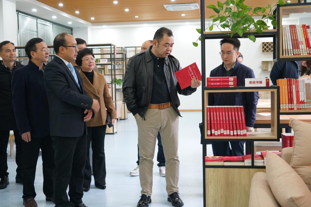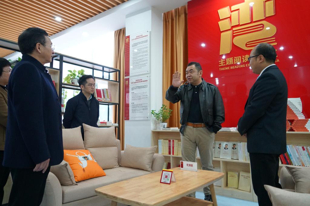 刘楠飞(中)到beat365“红湾”主题阅读体验区调研