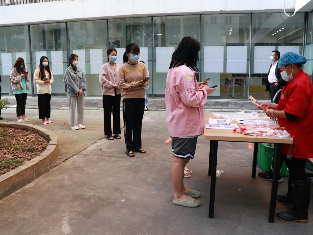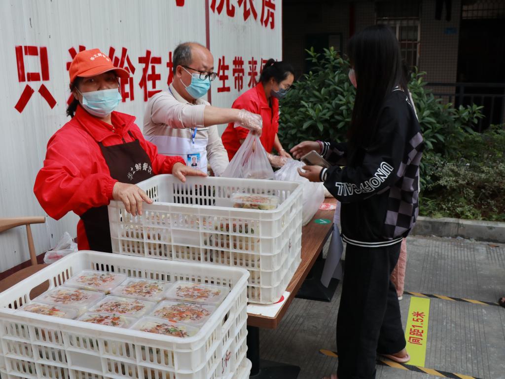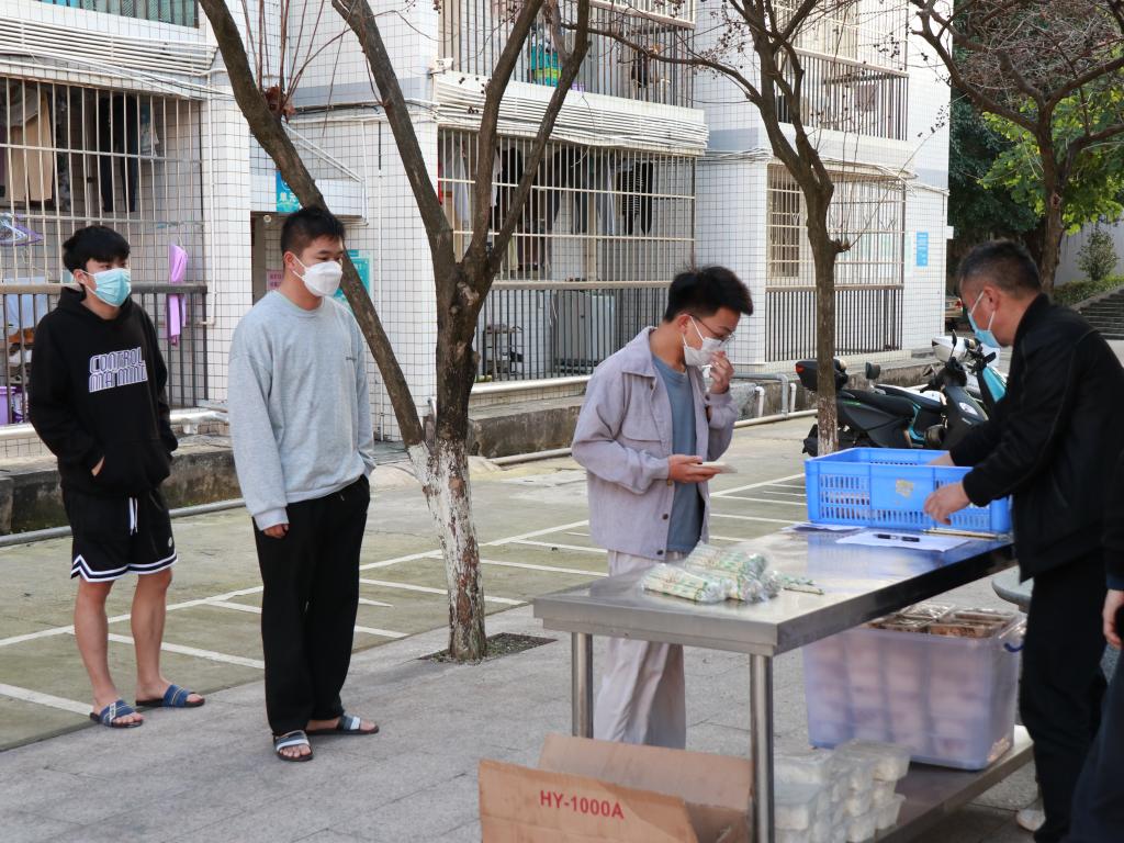 封闭管理期间,学校要求,每宿舍派1-2名学生在指定时间到楼栋前领餐,必须佩戴口罩,做好个人防护,实行一米线间隔排队有序领取。