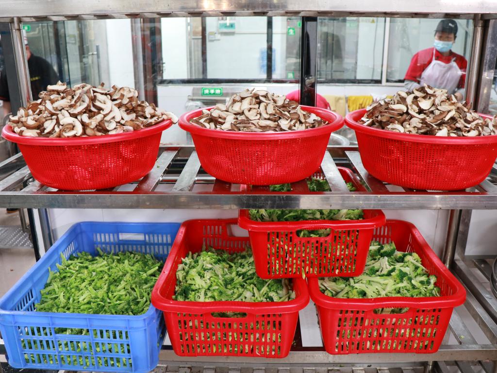 “我们每天要采购一千三百斤的新鲜猪肉,不使用冷冻肉。”吴经理说。为保证菜品质量,第一食堂工作人员在凌晨三四点,就要出发采购新鲜菜品了。大量新鲜的菜品采购回来后,还要开展清洗处理、烹饪、分装、打包等环节。“我们每班次都要安排70多名工作人员,各环节分工合理,相互配合,保证饭菜准时到达学生手中。”