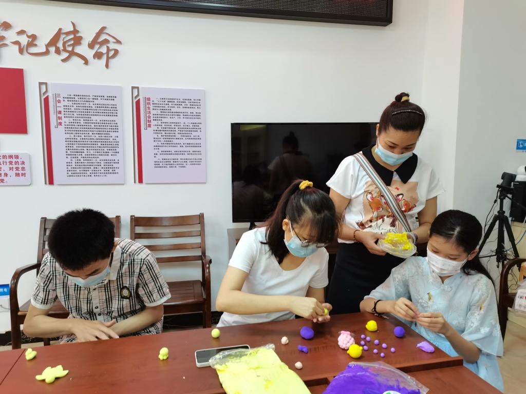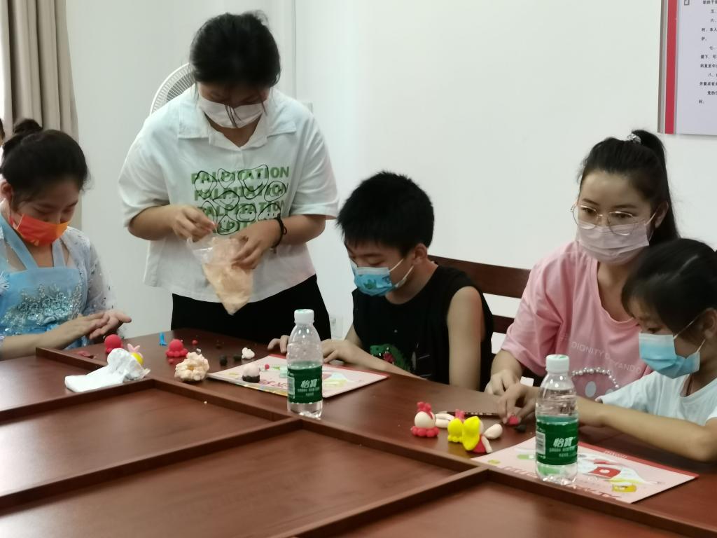小朋友在老师的指导下与家长共同完成黏土卡通
