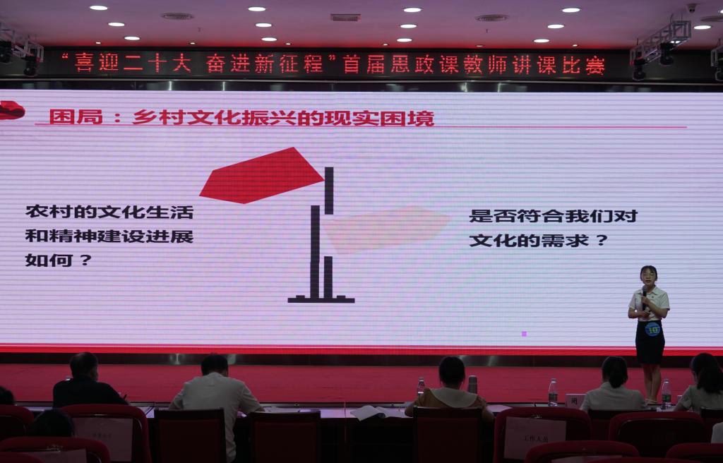 比赛中,参赛选手按照赛前抽签顺序依次上台进行演讲。教师们的演讲内容紧紧围绕“喜迎二十大 永远跟党走 奋进新征程”主题,从理想信念、核心价值观培养、乡村产业振兴等专题分别阐述自己的理解与感悟。