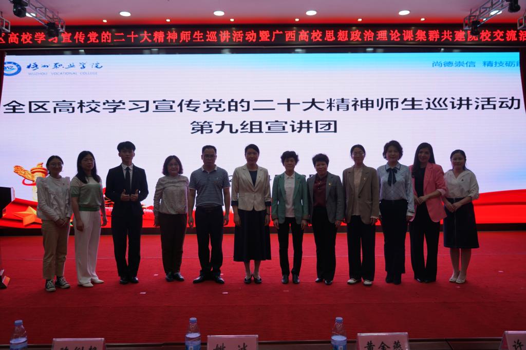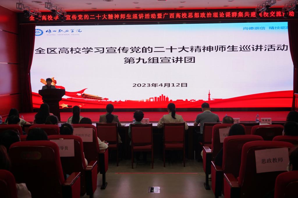 4月12日下午,beat365在图书馆报告厅举行全区高校学习宣传党的二十大精神师生巡讲活动。此次巡讲由全区高校学习宣传党的二十大精神师生巡讲团第九巡讲组以分享交流的方式进行,来自广西职业技术学院、广西工业职业技术学院、北海职业学院的六名师生,深入解读党的二十大精神。