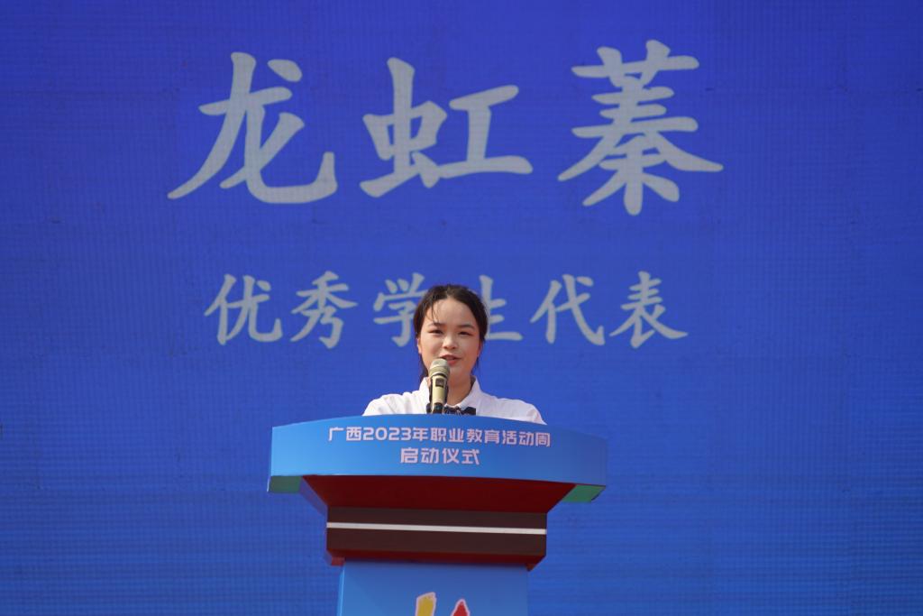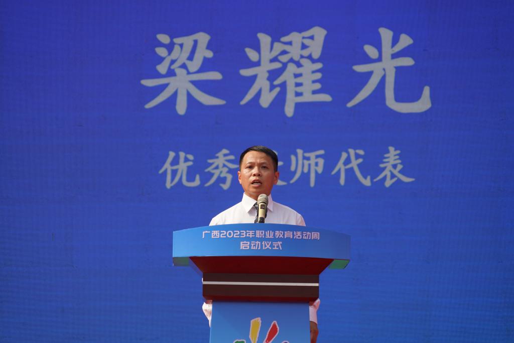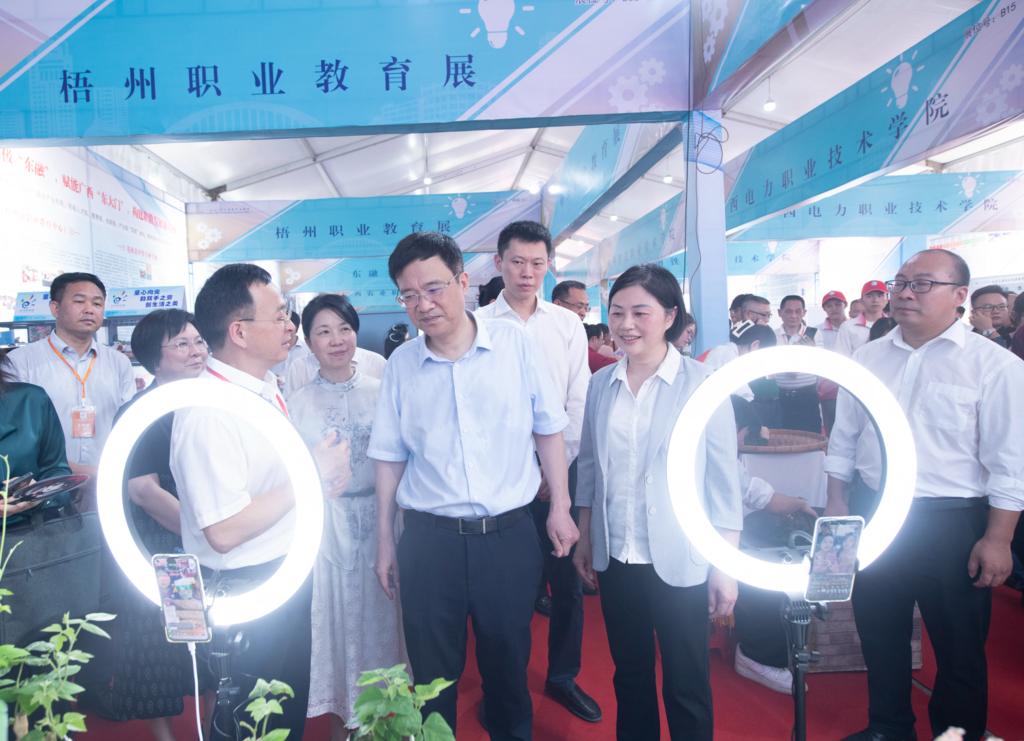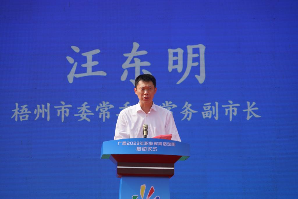 5月18日,广西2023年职业教育活动周启动仪式在beat365英国官网网站举行。自治区党委教育工委书记,自治区教育厅党组书记、厅长刘友谊,梧州市委常委、常务副市长汪东明,梧州市副市长苏颖参加启动仪式,启动仪式由自治区教育厅党组副书记、副厅长、一级巡视员黄雄彪主持。
