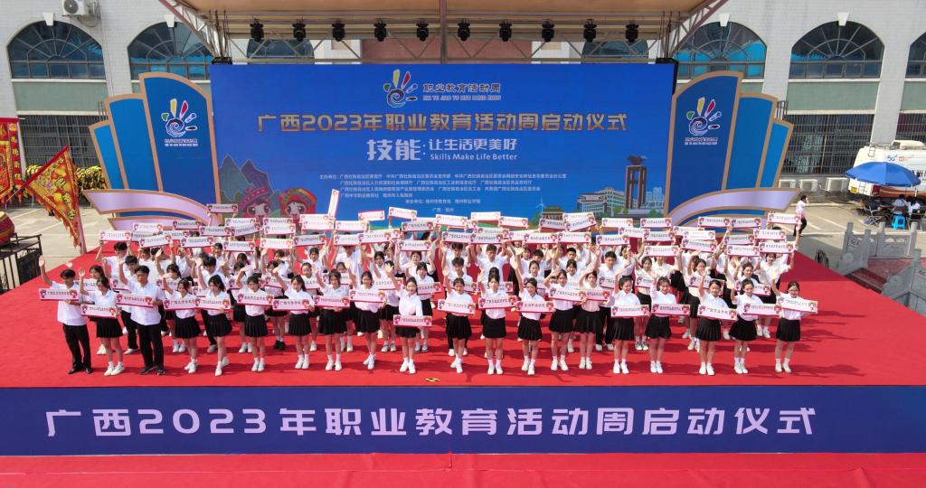 参加启动仪式的还有,自治区党委宣传部、党委网信办、人力资源社会保障厅、工业和信息化厅、农业农村厅、国资委、总工会、团区委、中华职教社、梧州市政府等单位领导,各市教育局和人力资源社会保障局分管负责人和对应科室负责人,高等职业院校、区直中等职业学校、市县属中等职业学校主要负责人,各职教师资基地负责人,广西开放大学负责人,行业、企业代表,部分小学、初中、高中和职业院校的学生、家长代表以及新闻媒体朋友等社会各界人士1000余人。