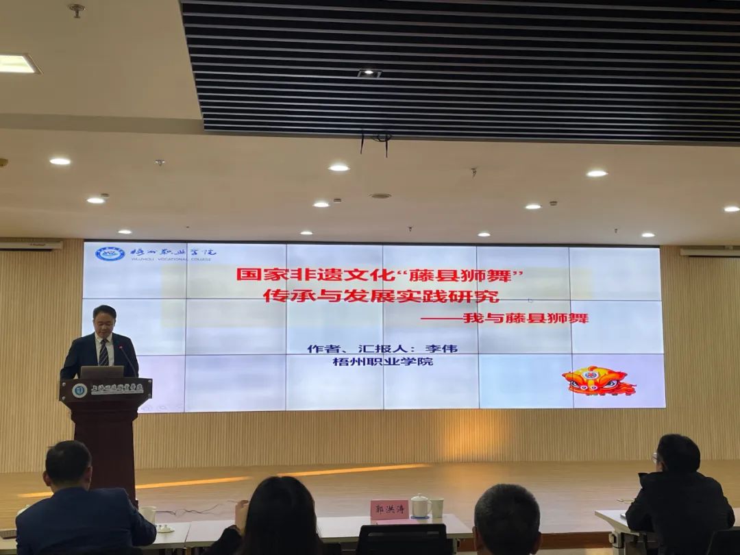 与会期间,专家学者围绕共同探讨舞龙舞狮运动的传承与发展,分享最新的研究成果与教学经验。李伟副院长以《国家非遗文化“藤县狮舞”传承与发展实践研究——我与藤县狮舞》为题作了交流发言,他通过“我与狮舞”“缘起梧州”“国家非遗文化‘藤县狮舞’的历史及由来”“国家非遗文化‘藤县狮舞’成效与做法”“国家非遗文化‘藤县狮舞’传承与发展的四化对策”等五个方面,聚焦国家非遗文化“藤县狮舞”的传承与发展,分析藤县狮舞目前面临的困难,阐述如何通过“四化策略”,形成有“造血功能”的藤县狮舞产业链,让国家非遗文化在新时代绽放新光彩。