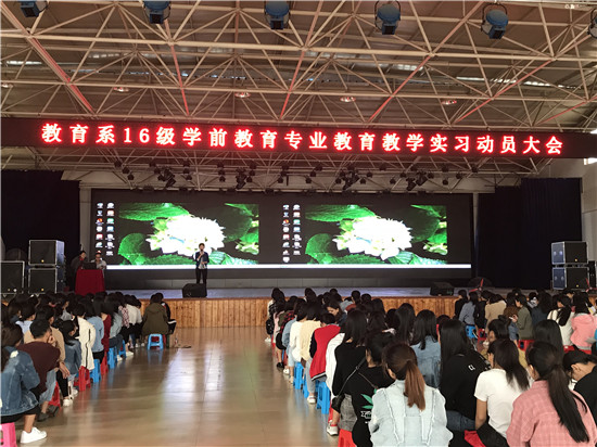 10月11日下午,教育系举行16级教学实习动员大会。系主任姚冰,副主任余迅雷出席大会,各科任老师、16级学前教育专业全体学生共同参加大会。