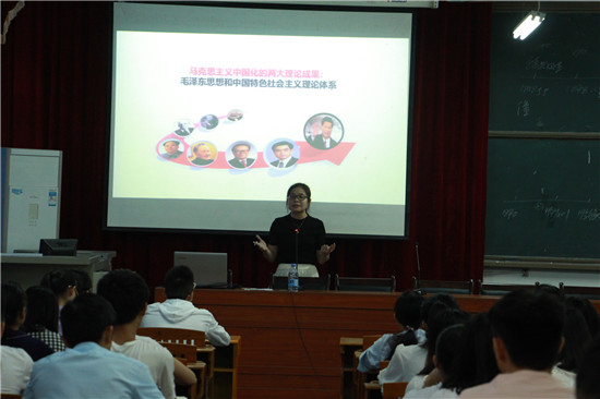 通过讲述改变中国命运的3个重大事件,黄淑燕导出了马克思主义不仅深刻改变了世界,也深刻改变了中国的真理。通过在黑板上以时间轴的形式为同学总结出在重要的时间节点,她有条不紊地向同学们系统地解释了马克思主义中国化的历史进程,阐述了毛泽东思想和中国特色社会主义理论体系是马克思主义中国化的两大理论成果,鼓励同学们努力学好知识,勇于实践探索。