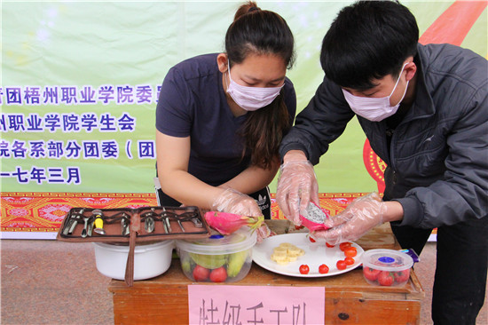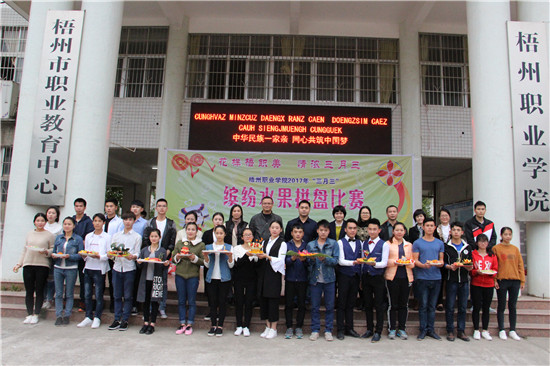3月27日,为庆祝壮族“三月三”,院团委组织开展“花样梧职美,情浓三月三”缤纷水果拼盘比赛。团委副书记黄宇云、银翠娇以及各系部领导出席并担任评委。300多名师生观看了比赛。