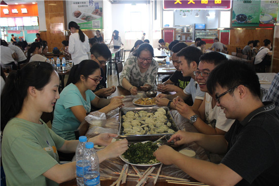 跳竹竿和滚铁环之后,活动现场由风雨球场转移到第二食堂,开始进行包饺子比赛,比赛采取奖罚制度,包得最少的一组要接受惩罚,开始口号刚响起,每个组的成员就开始马不停蹄地动起手来,现场热闹非凡,笑声不断。学院领导张凌贞、聂振传、杨静锦、梁小坚、皮至明、胡江枫,兴龙办事处、红岭社区负责人廖志雄、林丽君、李惠芬以及学院7个基层党支部的负责人、部分社区群众也来到现场,与同学们一起参加活动并分享品尝了自己动手制作的美味饺子。