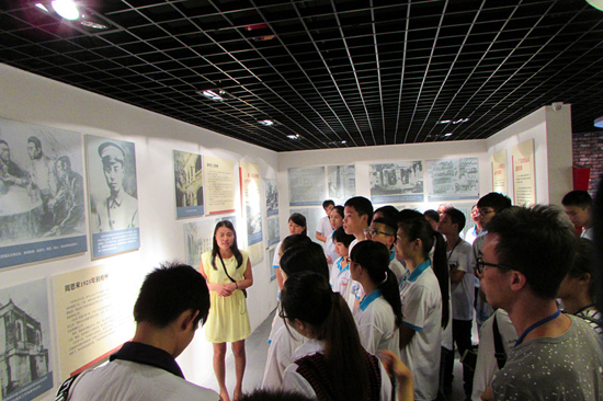三下乡服务队队队员在认真听讲解员介绍英雄革命历史