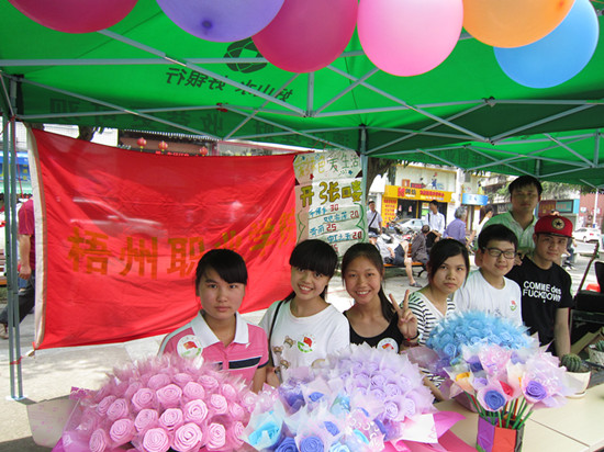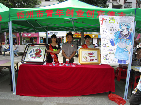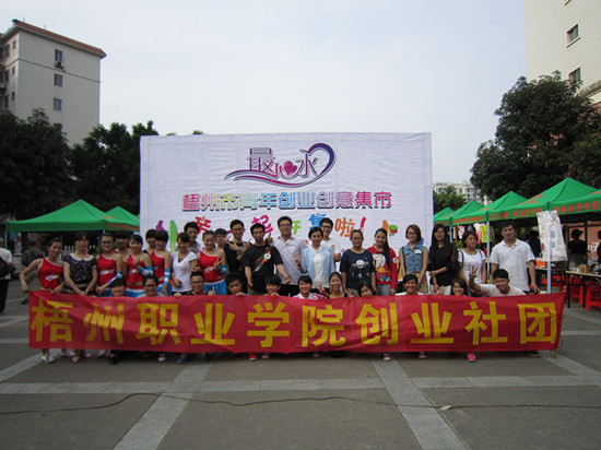“五四”青年节下午,潘塘公园广场上青春飞扬,热闹非凡,一个创意作品集市在欢乐中形成。由青年学生组成的学院8支创业团队在此参加梧州市青年创业创意集市展销活动。梧州市委副书记全桂寿,市委副秘书长、市绩效办主任蓝盛新,团市委书记卢宽以及学院副院长皮至明等领导出席了活动现场。