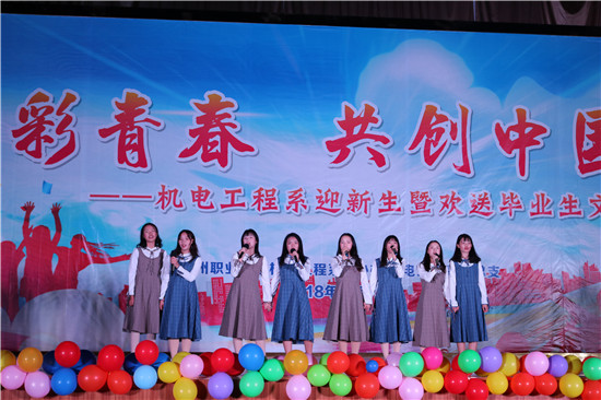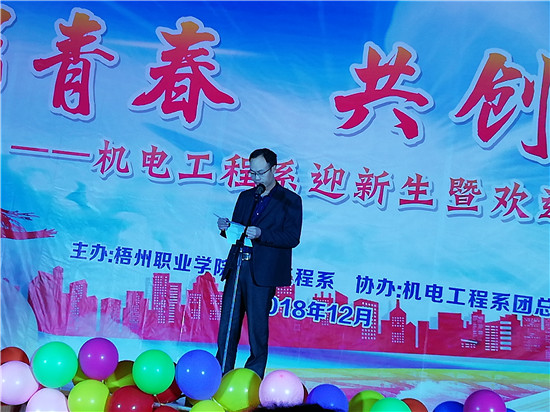 唐永平在致辞中向中国改革开放风雨四十载致敬。他说,机电系沐浴在改革的春风中,不断发展,目前全系在校生1000多人,开设有机电一体化、信息安全与管理等7个专业。希望机电系的同学们在求学求知的路上演绎多彩青春,同筑中国梦。