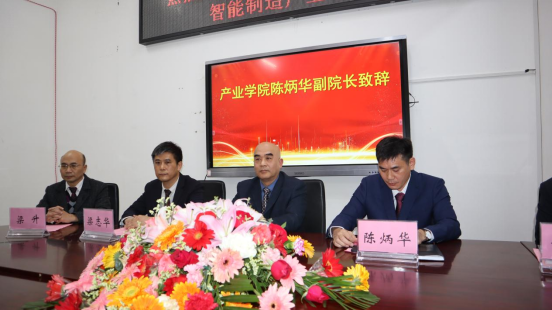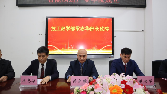 广西华熙教育科技有限公司董事长、技工教学部智能制造产业学院副院长陈炳华也在会上致辞并回顾了双方既往的良好合作发展历程,介绍了产业学院的发展规划。他希望双方以本次签约为契机,继续深化产教融合,推进专业建设,建立工学一体化人才培养模式,助力技工教学部创建高级技工学校。