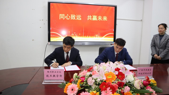 仪式上,技工教学部党委副书记、部长梁志华与广西华熙教育科技有限公司董事长、技工教学部智能制造产业学院副院长陈炳华先生分别在战略合作协议上签字。