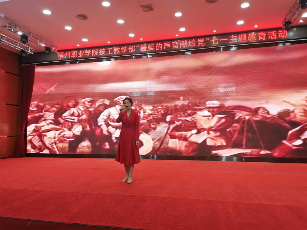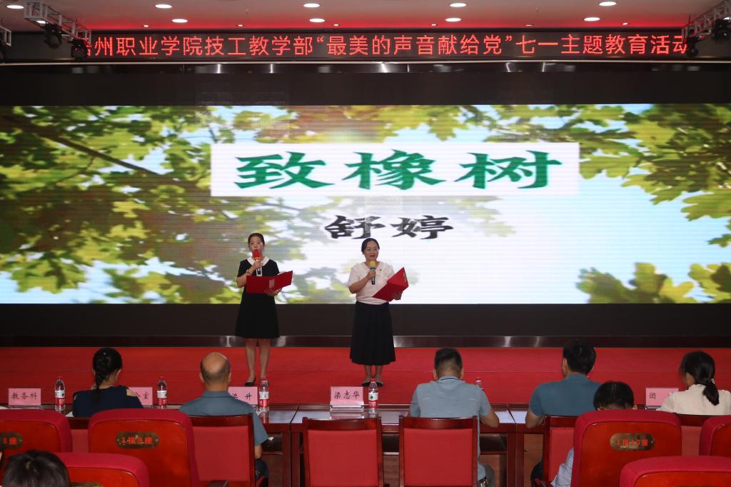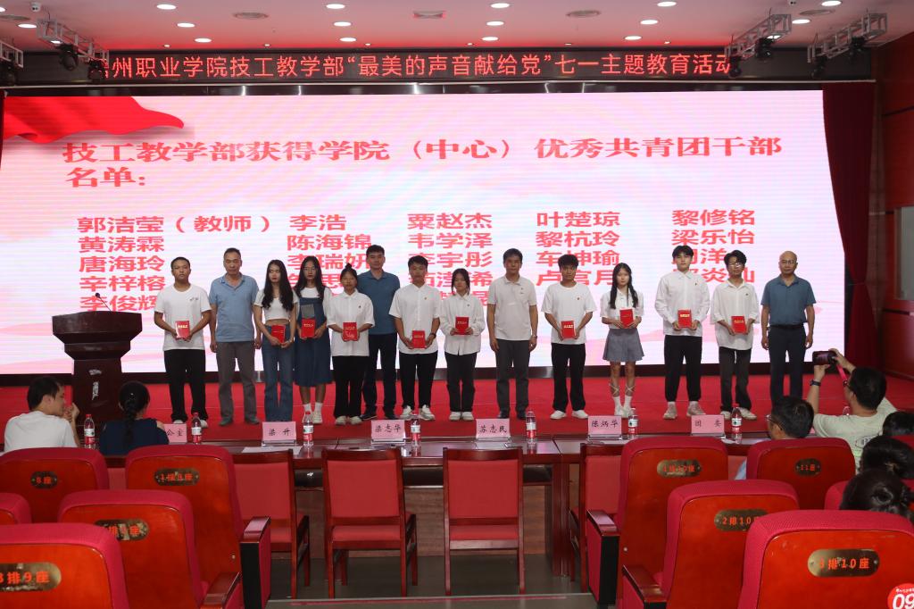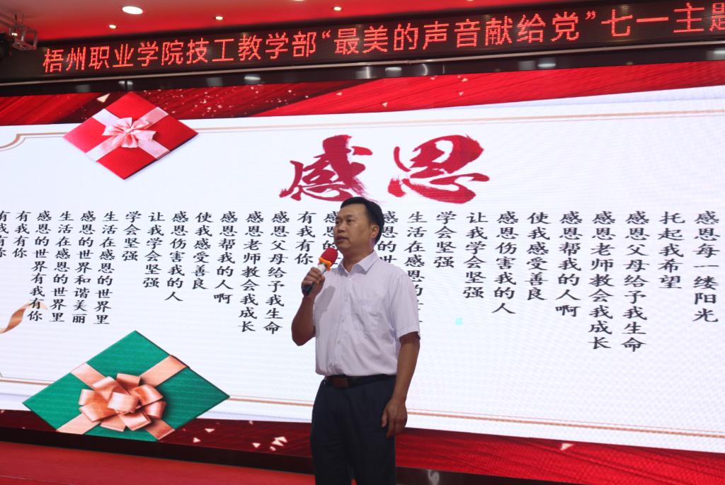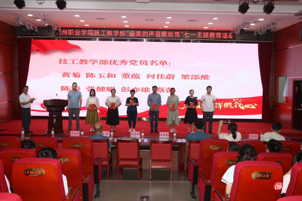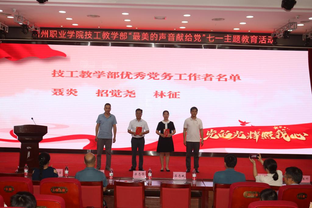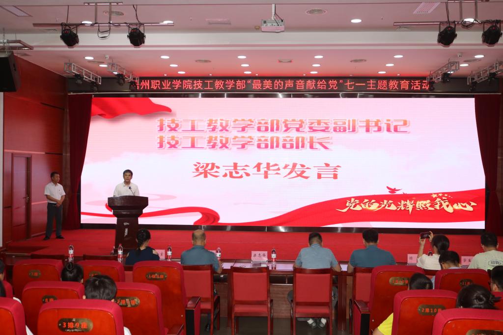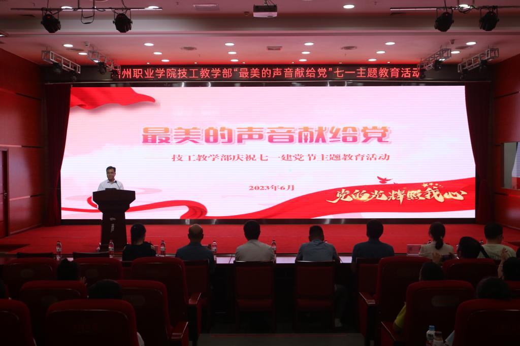 技工教学部于6月25日在图书馆报告厅开展了“最美的声音献给党”七一主题教育活动。技工教学部党委副书记、部长梁志华,技工教学部党委委员、副部长苏志民,技工教学部副部长梁升,技工教学部智能制造产业学院副院长陈炳华出席,教学部各部门的主要领导、党员、教师、团员、学生代表们参加此次活动。