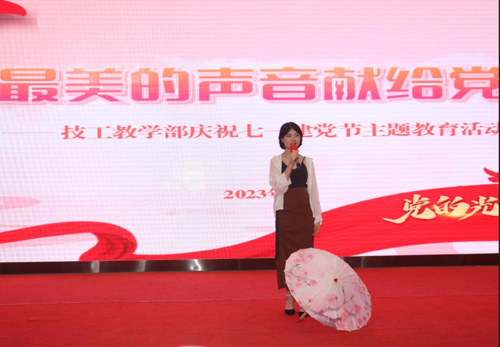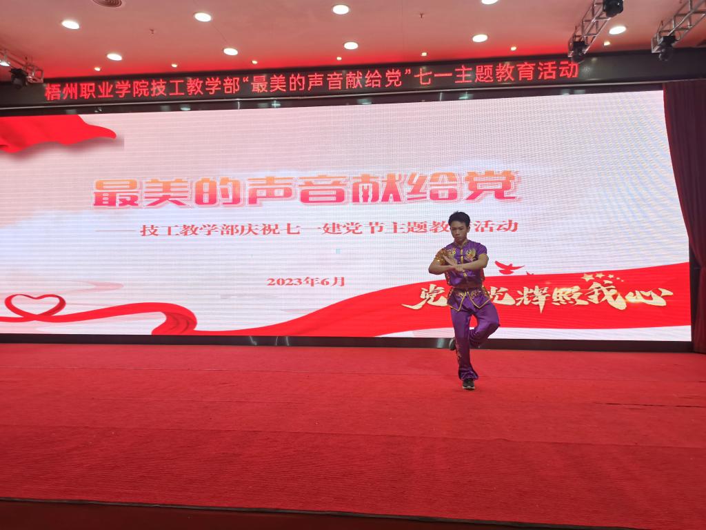 接着活动进入“最美的声音献给党”演出环节。2023年技工教学部组织师生参加了各级演讲、朗诵、唱歌比赛,均获得较好成绩,本次表演环节精选了部分获奖作品。获得梧州市经典诵读大赛特等奖的吴伟莹老师以一首诗朗诵《英雄》,歌颂无数平凡的英雄铸就中华民族的铁骨铮铮。歌曲《明天,你好》《奉陪》、朗诵《走向远方》表达了新时代青年面向未来的积极向上。演讲《风铃花的春天》讲述了贫困学生在国家资助政策帮助下不忘党恩刻苦学习奋进新征程。诗朗诵《月光下的中国》抒发了师生对繁荣富强的祖国深沉的热爱之情和对底蕴深厚的历史文化的自豪之情。《致橡树》给观众展示爱情的浪漫与纯净的美好。武术表演、歌曲《牵丝戏》《美丽神奇的地方》将中华民族传统文化淋漓尽致的展现在师生面前。技工教学部师生用属于自己的方式祝福党的生日,将最美的声音献给党。