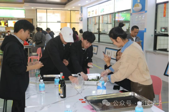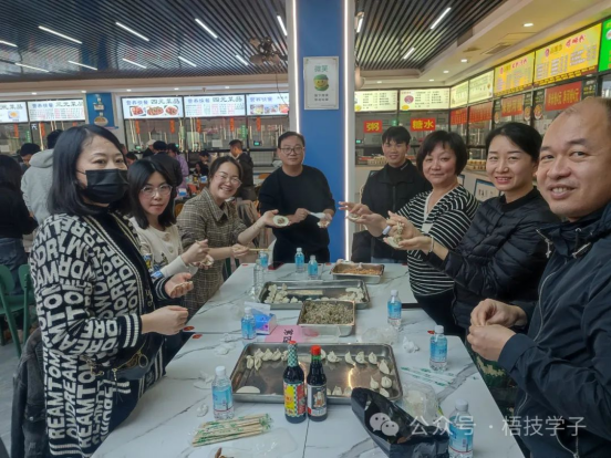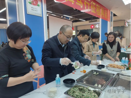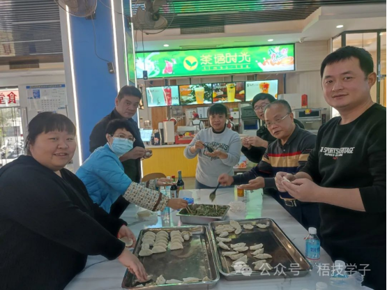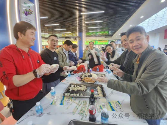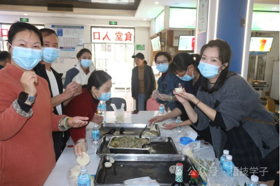 活动在教师座谈后进入到包饺子环节。大家互相切磋手艺,交流包饺子的技巧和经验,共同提高包饺子的水平。在大家互帮互助、默契配合下,共同完成了一道道美味的饺子。这不仅增进彼此之间的感情,也培养大家的团队意识和合作能力。包着饺子,说着暖心的家常,师生们将一年的祝福和喜悦包进了一个个饱满的饺子中。