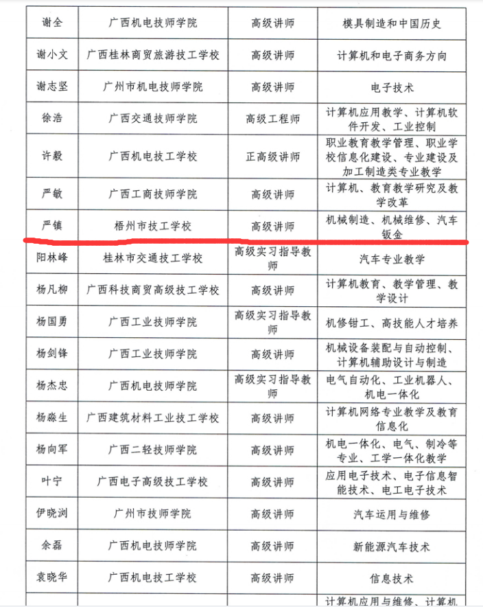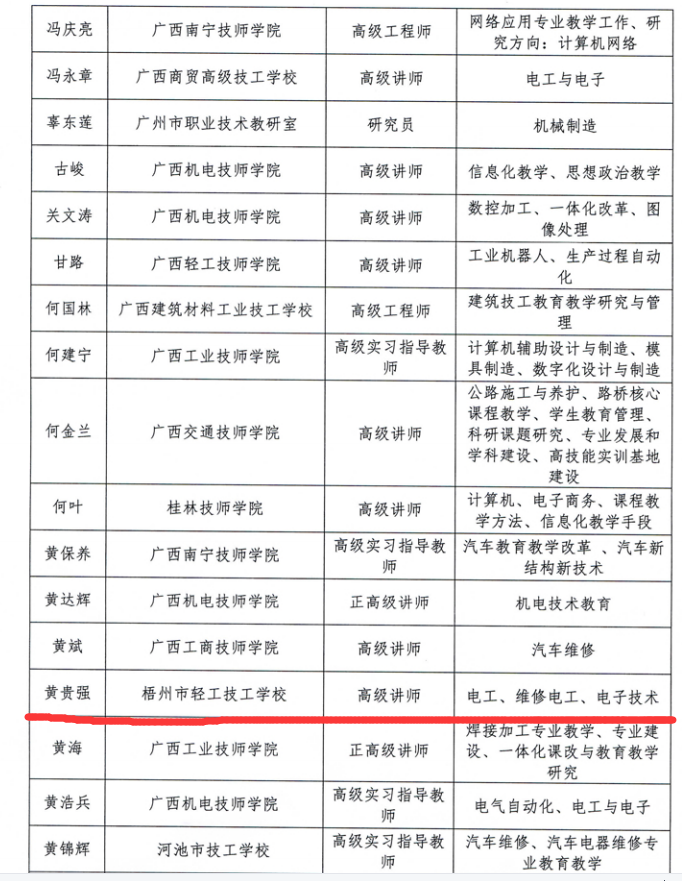 根据广西壮族自治区技工教育研究室《关于公布广西技工教育教科研专家库专家名单的通知》,技工教学部黄赛雄、严镇、黄贵强有三名教师入选。
