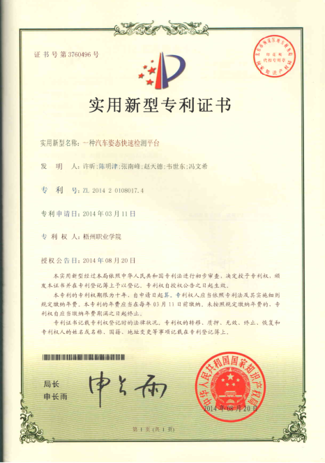由学院教师为主体联合发明的一种汽车姿态快速检测平台最近通过国家知识产权局初步审查,被该局授予专利证书。这是学院成立以来获得的首项专利。