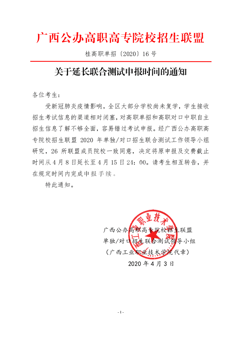 受新冠肺炎疫情影响,全区大部分学校尚未复学,学生接收招生考试信息的渠道相对闭塞,对高职单招和高职对口中职自主招生信息了解不够全面,容易错过考试申报。经广西公办高职高专院校招生联盟2020年单独/对口招生联合测试工作领导小组研究,26所联盟成员院校一致同意,决定将原申报及交费截止时间从4月8日延长至4月15日24:00。请考生相互转告,并在规定时间内完成申报手续。