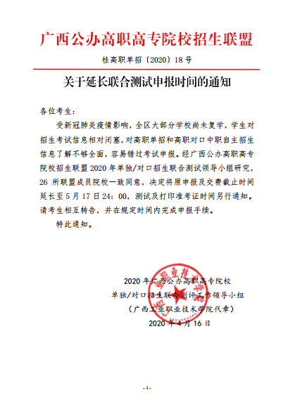 各位考生: 受新冠肺炎疫情影响,全区大部分学校尚未复学,学生对 招生考试信息相对闭塞,对高职单招和高职对口中职自主招生 信息了解不够全面,容易错过考试申报。经广西公办高职高专 院校招生联盟 2020 年单独/对口招生联合测试领导小组研究, 26 所联盟成员院校一致同意,决定将原申报及交费截止时间 延长至 5 月 17 日 24:00,测试及打印准考证时间另行通知。 请考生相互转告,并在规定时间内完成申报手续。